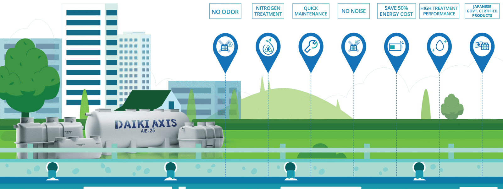 At Daiki Axis India, we care deeply for the planet and its people. Through innovative Johkasou (decentralized STP) systems, we’re transforming wastewater into a sustainable resource — protecting communities, preserving water, and pioneering change for a cleaner India which also follows our global mission - Protect x Change